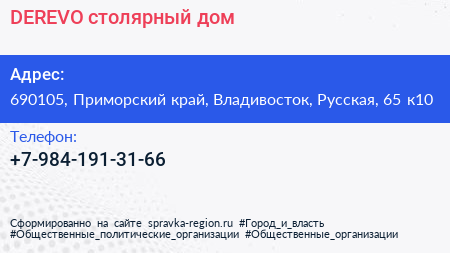 DEREVO, столярный дом по адресу 690105, Приморский край, Владивосток, Русская, 65 к10 в дальнейшем Организация, размещена в следующих категориях: