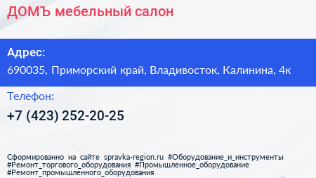 ДОМЪ, мебельный салон по адресу 690035, Приморский край, Владивосток, Калинина, 4к в дальнейшем Организация, размещена в следующих категориях: