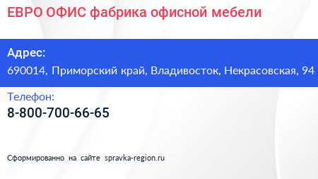 ЕВРО ОФИС, фабрика офисной мебели по адресу 690014, Приморский край, Владивосток, Некрасовская, 94 в дальнейшем Организация, размещена в следующих категориях: