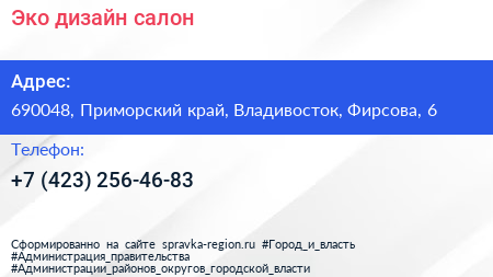 Эко-дизайн, салон по адресу 690048, Приморский край, Владивосток, Фирсова, 6 в дальнейшем Организация, размещена в следующих категориях:
