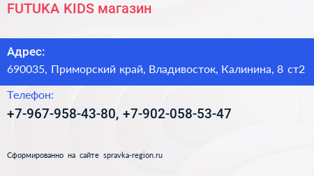 FUTUKA KIDS, магазин по адресу 690035, Приморский край, Владивосток, Калинина, 8 ст2 в дальнейшем Организация, размещена в следующих категориях: