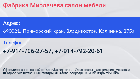 Фабрика Мирлачева, салон мебели по адресу 690021, Приморский край, Владивосток, Калинина, 275а в дальнейшем Организация, размещена в следующих категориях: