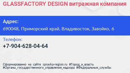 GLASSFACTORY DESIGN, витражная компания по адресу 690048, Приморский край, Владивосток, Завойко, 6 в дальнейшем Организация, размещена в следующих категориях: