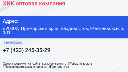ХИК, оптовая компания по адресу 690002, Приморский край, Владивосток, Мельниковская, 101 в дальнейшем Организация, размещена в следующих категориях: