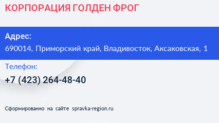 КОРПОРАЦИЯ ГОЛДЕН ФРОГ по адресу 690014, Приморский край, Владивосток, Аксаковская, 1 в дальнейшем Организация, размещена в следующих категориях: