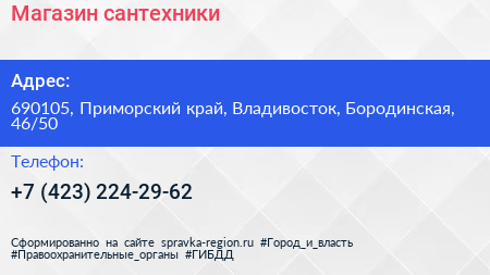 Магазин сантехники по адресу 690105, Приморский край, Владивосток, Бородинская, 46/50 в дальнейшем Организация, размещена в следующих категориях: