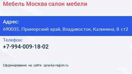 Мебель-Москва, салон мебели по адресу 690035, Приморский край, Владивосток, Калинина, 8 ст2 в дальнейшем Организация, размещена в следующих категориях: