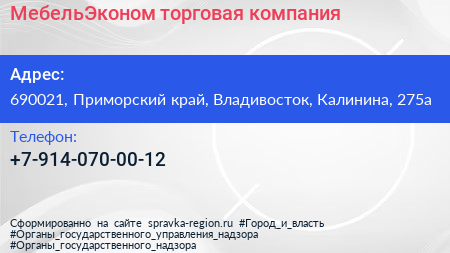 МебельЭконом, торговая компания по адресу 690021, Приморский край, Владивосток, Калинина, 275а в дальнейшем Организация, размещена в следующих категориях: