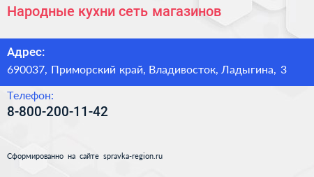 Народные кухни, сеть магазинов по адресу 690037, Приморский край, Владивосток, Ладыгина, 3 в дальнейшем Организация, размещена в следующих категориях: