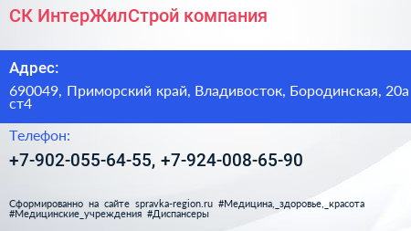 СК ИнтерЖилСтрой, компания по адресу 690049, Приморский край, Владивосток, Бородинская, 20а ст4 в дальнейшем Организация, размещена в следующих категориях: