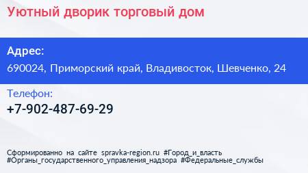 Уютный дворик, торговый дом по адресу 690024, Приморский край, Владивосток, Шевченко, 24 в дальнейшем Организация, размещена в следующих категориях:
