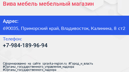Вива мебель, мебельный магазин по адресу 690035, Приморский край, Владивосток, Калинина, 8 ст2 в дальнейшем Организация, размещена в следующих категориях: