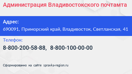 Администрация Владивостокского почтамта по адресу 690091, Приморский край, Владивосток, Светланская, 41 в дальнейшем Организация, размещена в следующих категориях: