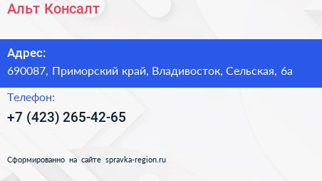 Альт Консалт по адресу 690087, Приморский край, Владивосток, Сельская, 6а в дальнейшем Организация, размещена в следующих категориях: