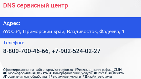 DNS, сервисный центр по адресу 690034, Приморский край, Владивосток, Фадеева, 1 в дальнейшем Организация, размещена в следующих категориях:
