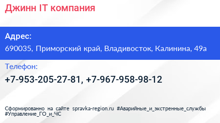Джинн, IT-компания по адресу 690035, Приморский край, Владивосток, Калинина, 49а в дальнейшем Организация, размещена в следующих категориях: