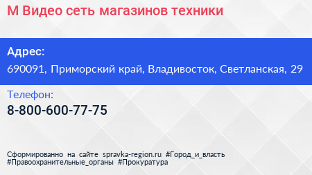 М.Видео, сеть магазинов техники по адресу 690091, Приморский край, Владивосток, Светланская, 29 в дальнейшем Организация, размещена в следующих категориях: