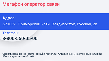 Мегафон, оператор связи по адресу 690039, Приморский край, Владивосток, Русская, 2к в дальнейшем Организация, размещена в следующих категориях: