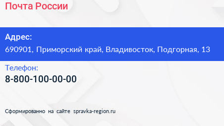 Почта России по адресу 690901, Приморский край, Владивосток, Подгорная, 13 в дальнейшем Организация, размещена в следующих категориях: