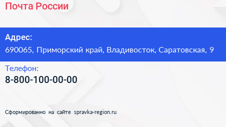 Почта России по адресу 690065, Приморский край, Владивосток, Саратовская, 9 в дальнейшем Организация, размещена в следующих категориях: