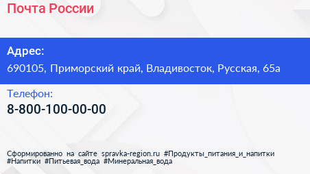 Почта России по адресу 690105, Приморский край, Владивосток, Русская, 65а в дальнейшем Организация, размещена в следующих категориях:
