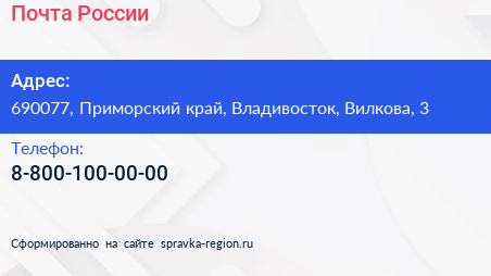 Почта России по адресу 690077, Приморский край, Владивосток, Вилкова, 3 в дальнейшем Организация, размещена в следующих категориях: