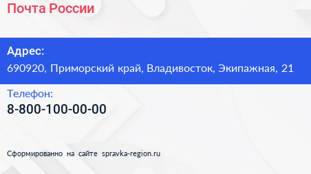 Почта России по адресу 690920, Приморский край, Владивосток, Экипажная, 21 в дальнейшем Организация, размещена в следующих категориях: