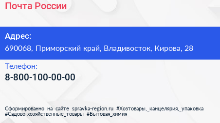 Почта России по адресу 690068, Приморский край, Владивосток, Кирова, 28 в дальнейшем Организация, размещена в следующих категориях: