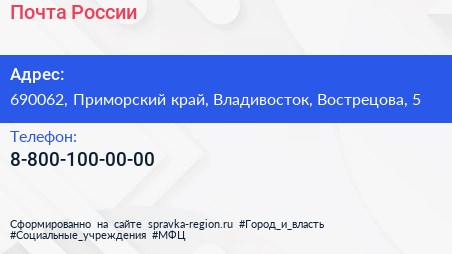Почта России по адресу 690062, Приморский край, Владивосток, Вострецова, 5 в дальнейшем Организация, размещена в следующих категориях: