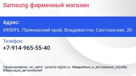 Samsung, фирменный магазин по адресу 690091, Приморский край, Владивосток, Светланская, 20 в дальнейшем Организация, размещена в следующих категориях: