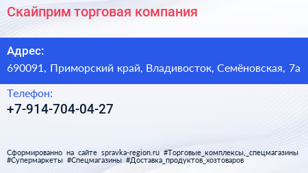 Скайприм, торговая компания по адресу 690091, Приморский край, Владивосток, Семёновская, 7а в дальнейшем Организация, размещена в следующих категориях: