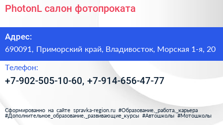 PhotonL, салон фотопроката по адресу 690091, Приморский край, Владивосток, Морская 1-я, 20 в дальнейшем Организация, размещена в следующих категориях: