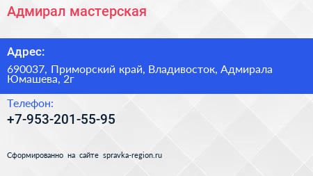 Адмирал, мастерская по адресу 690037, Приморский край, Владивосток, Адмирала Юмашева, 2г в дальнейшем Организация, размещена в следующих категориях: