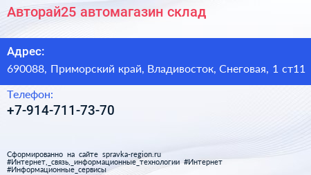 Авторай25, автомагазин-склад по адресу 690088, Приморский край, Владивосток, Снеговая, 1 ст11 в дальнейшем Организация, размещена в следующих категориях: