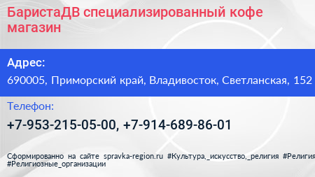 БаристаДВ, специализированный кофе-магазин по адресу 690005, Приморский край, Владивосток, Светланская, 152 в дальнейшем Организация, размещена в следующих категориях: