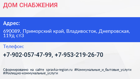 ДОМ СНАБЖЕНИЯ по адресу 690089, Приморский край, Владивосток, Днепровская, 119д ст3 в дальнейшем Организация, размещена в следующих категориях: