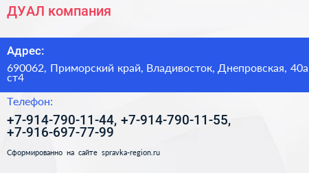 ДУАЛ, компания по адресу 690062, Приморский край, Владивосток, Днепровская, 40а ст4 в дальнейшем Организация, размещена в следующих категориях: