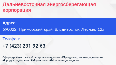 Дальневосточная энергосберегающая корпорация по адресу 690022, Приморский край, Владивосток, Лесная, 12а в дальнейшем Организация, размещена в следующих категориях:
