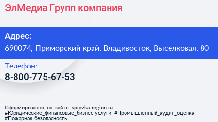 ЭлМедиа Групп, компания по адресу 690074, Приморский край, Владивосток, Выселковая, 80 в дальнейшем Организация, размещена в следующих категориях:
