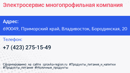 Электросервис, многопрофильная компания по адресу 690049, Приморский край, Владивосток, Бородинская, 20 в дальнейшем Организация, размещена в следующих категориях: