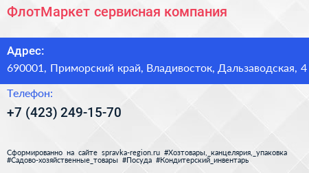 ФлотМаркет, сервисная компания по адресу 690001, Приморский край, Владивосток, Дальзаводская, 4 в дальнейшем Организация, размещена в следующих категориях: