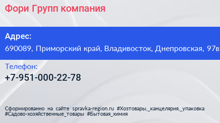 Фори-Групп, компания по адресу 690089, Приморский край, Владивосток, Днепровская, 97в в дальнейшем Организация, размещена в следующих категориях: