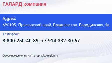 ГАЛАРД, компания по адресу 690105, Приморский край, Владивосток, Бородинская, 4а в дальнейшем Организация, размещена в следующих категориях: