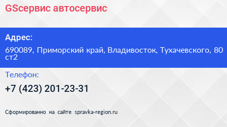 GSсервис, автосервис по адресу 690089, Приморский край, Владивосток, Тухачевского, 80 ст2 в дальнейшем Организация, размещена в следующих категориях: