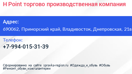 H-Point, торгово-производственная компания по адресу 690062, Приморский край, Владивосток, Днепровская, 21в в дальнейшем Организация, размещена в следующих категориях: