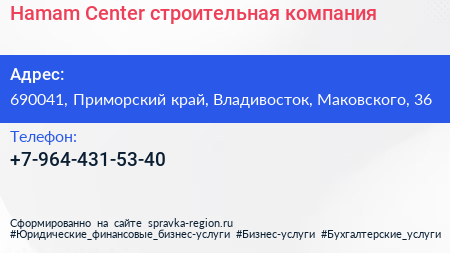 Hamam Center, строительная компания по адресу 690041, Приморский край, Владивосток, Маковского, 36 в дальнейшем Организация, размещена в следующих категориях: