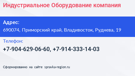 Индустриальное Оборудование, компания по адресу 690074, Приморский край, Владивосток, Руднева, 19 в дальнейшем Организация, размещена в следующих категориях: