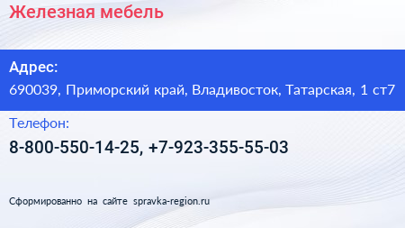 Железная мебель по адресу 690039, Приморский край, Владивосток, Татарская, 1 ст7 в дальнейшем Организация, размещена в следующих категориях: