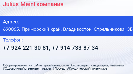 Julius Meinl, компания по адресу 690065, Приморский край, Владивосток, Стрельникова, 3Б в дальнейшем Организация, размещена в следующих категориях: