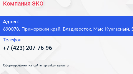 Компания ЭКО по адресу 690078, Приморский край, Владивосток, Мыс Кунгасный, 5 в дальнейшем Организация, размещена в следующих категориях: